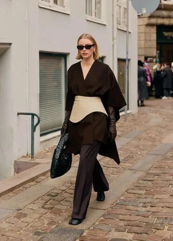 斗篷大衣,正是那个一披即成风景的存在。它不追求紧贴身形的修饰,而以流动的廓形与自然垂坠的线条,唤醒女性体态中最自信、最从容的一面。无论是在巴黎的石板街上,还是纽约的寒夜灯影中,斗篷的摆动总有一种独特的戏剧性——它让每一步都带着风,让每一次转身都成为镜头。