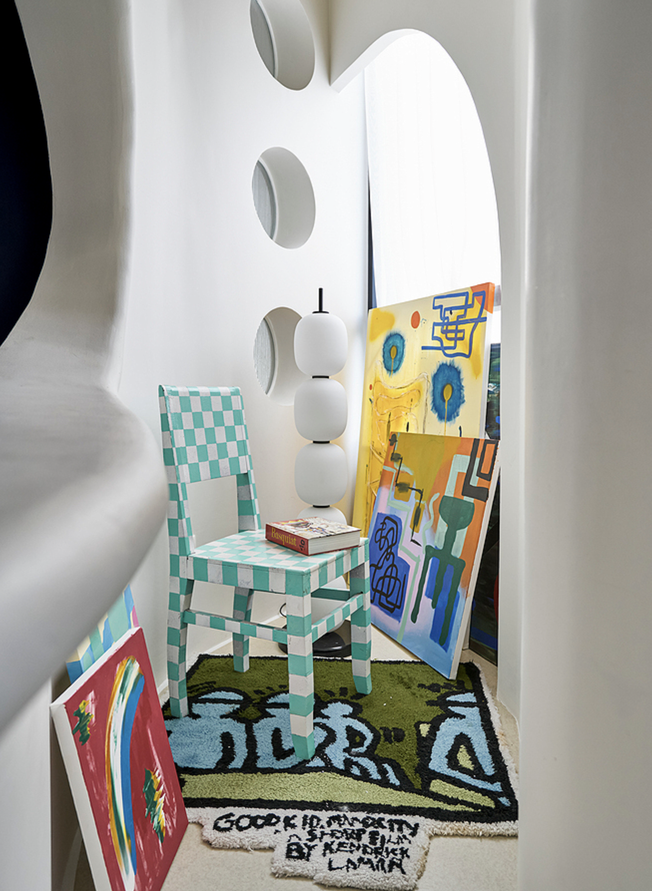 工作区同时也是观景台,卧室内部甚至浴室并没有用门连接,只以曲线和玻璃墙隔开,设计师们以主人的生活态度为灵感,创造了一个色彩鲜艳家的调色板,同时也创造了一个好玩的和梦幻般的艺术之家。