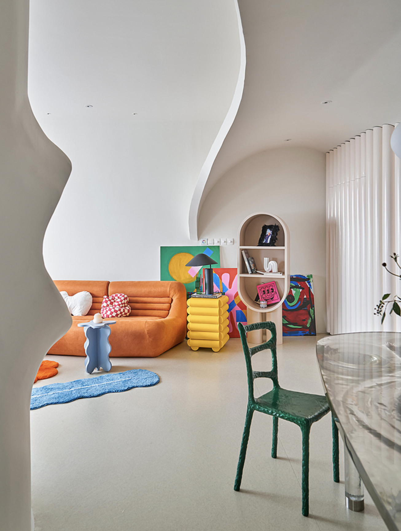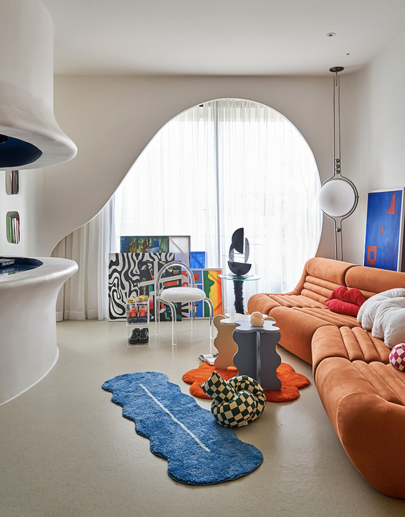 小公寓中的每一个角落都充满了惊喜,用圆弧和有趣的造型取代了直线和硬角,展示了每一个唯美质感的曲线。窗户和阳台入口被曲线覆盖,摆脱了那些常见的直线。小洞穴的对面是客厅,那张巨型“太空舱”沙发带有强烈风格印记,贴切反应了两位主人身为艺术工作者的审美追求。