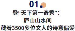 “匡庐奇秀,甲天下山。”矗立在长江与鄱阳湖交汇处的名山——庐山,藏着中国山水文化最动人的模样,曾引无数文人雅士为其赋诗。自司马迁在《史记》中写下“余南登庐山,观禹疏九江”后的2000多年里,共有3500多位文人为庐山写下16000余首诗歌。