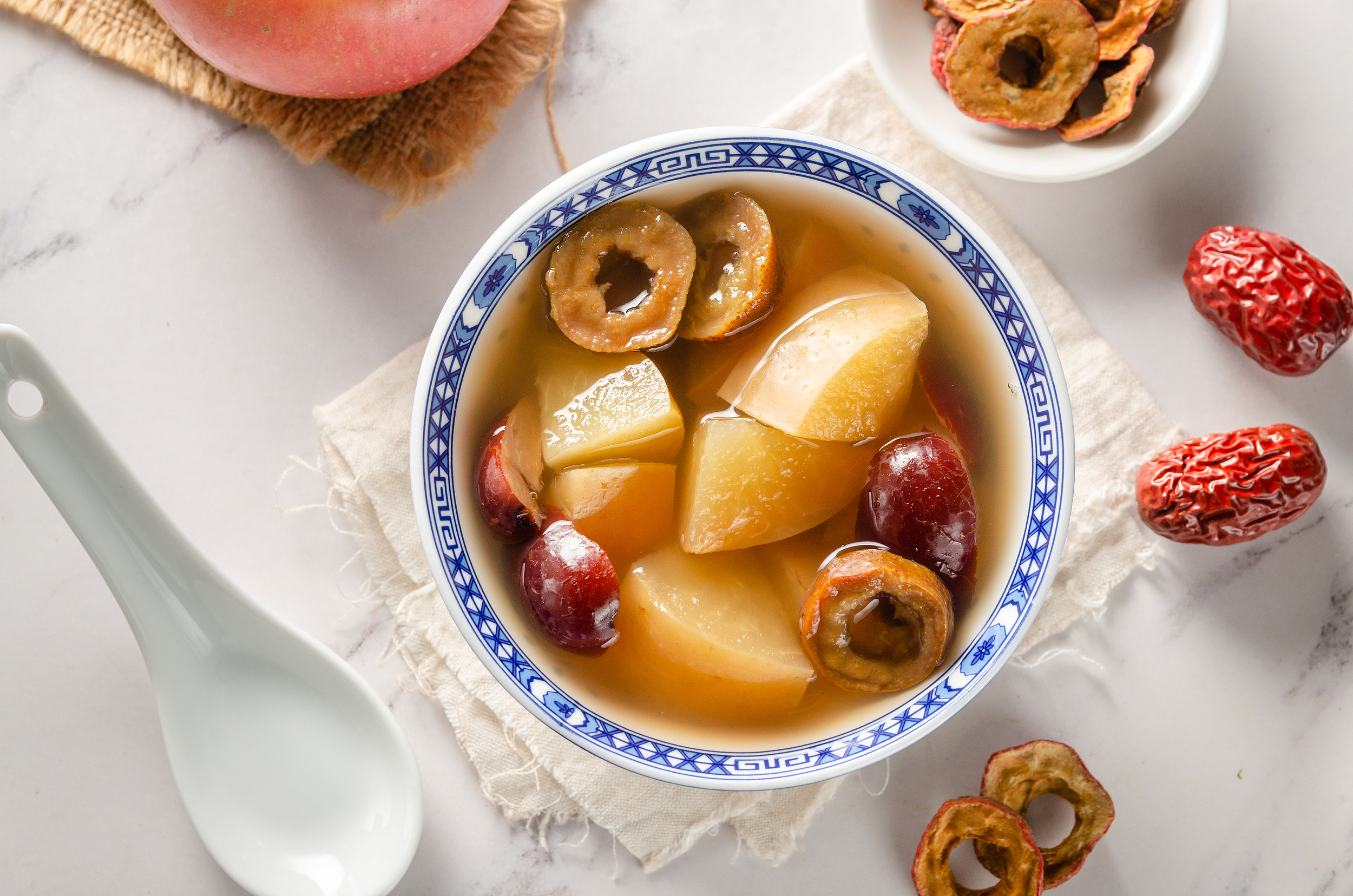 金秋时节,苹果和山楂才是绝配!新鲜山楂去核切半(山楂干也可以),苹果切小块和无花果、百合、陈皮一起入炖盅,这款汤刮油又减脂,只要坚持喝3天就能轻松掉秤,跟大肚腩说拜拜。