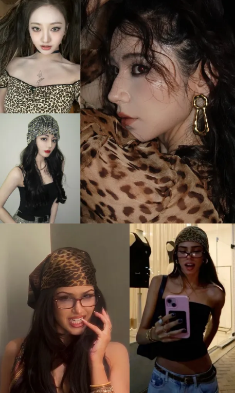 豹纹是最具张力的搭配,具有攻击性和暖调视觉冲击,与烟熏的灰调形成互补,用于发夹、小包或围巾等小面积点缀,会让整体更叛逆又不失性感。