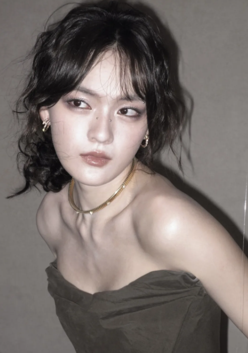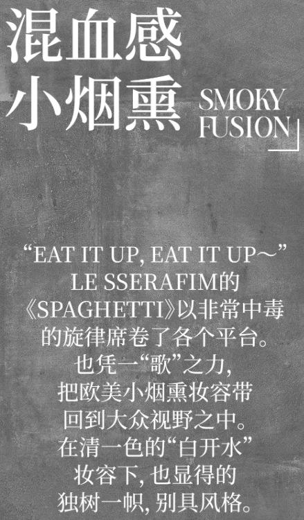 质地选择上,则以哑光占据主要位置,辅以极少量细腻微闪点亮眼球中心,让立体与深邃更自然;所有的晕染都应保持不对称的柔化,让粉影像雾一样散开,留下轻微颗粒感,却不显脏、不显厚,整体干净而有氛围。