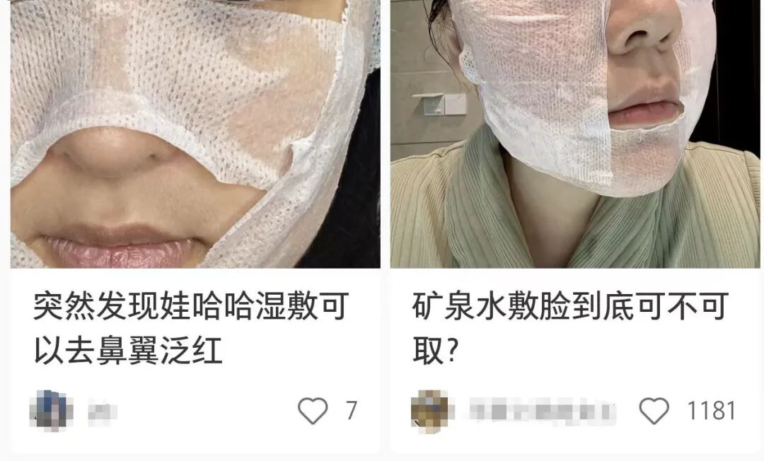 另外,还有人说不同品牌的矿泉水湿敷有不同的功效,这个属实有点夸张了,湿敷主要起到一个物理降温的作用,其他什么祛痘、祛黑头、收缩毛孔都是假的!