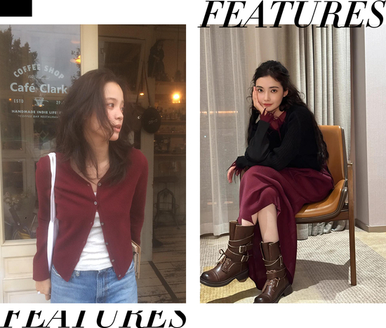 酒红色要怎么穿才不显老气?答案是控制面积和选对款式。一整套酒红色对大多数人来说都难以驾驭,但一件酒红色针织开衫或者一条半裙就友好得多。