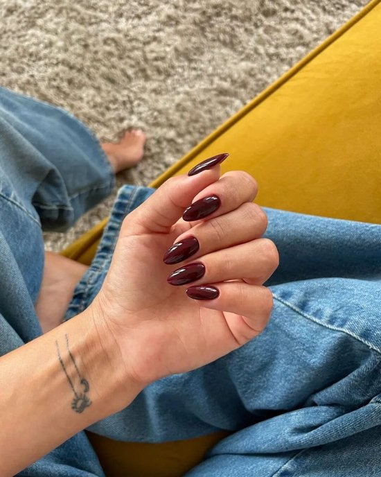 更简单的办法是把酒红色作为点缀色使用:在全黑造型里加一条酒红色围巾,在驼色大衣外系一条酒红色腰带,或者背一只酒红色的小包,甚至是酒红色美甲。这些小巧思能让你的穿搭立刻有重点,又不会过于张扬。