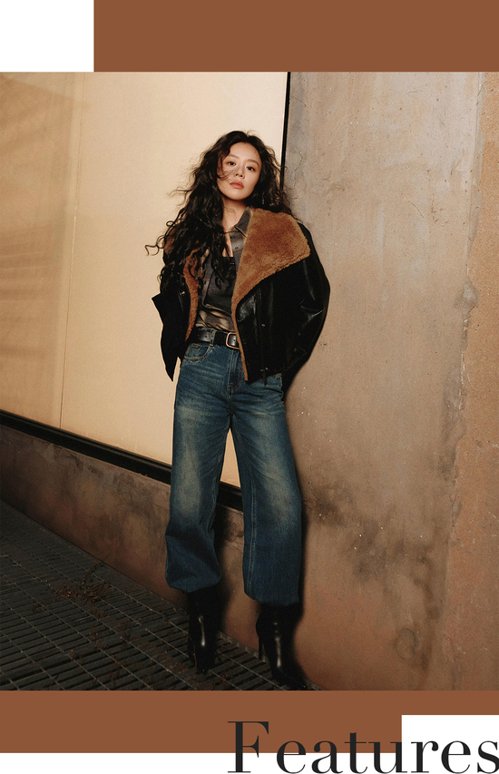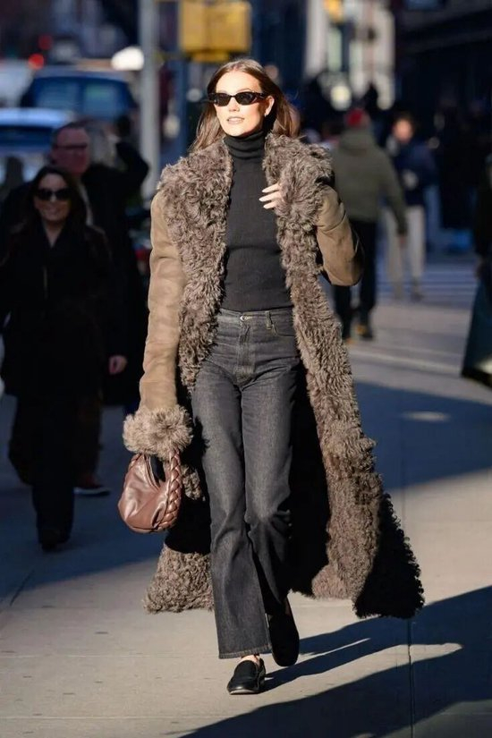 毛毛元素如何穿得不显臃肿?关键在“局部使用”。一件皮质夹克内衬换成羊羔毛,保暖度升级的同时保持了外套的利落轮廓。