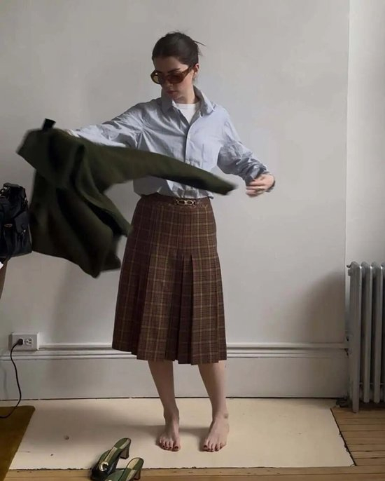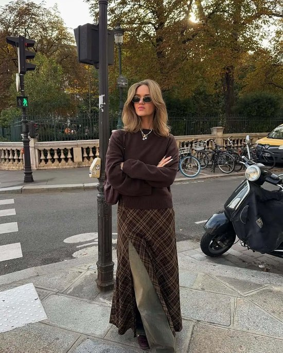 这种叠穿玩法还能再升级——直接把格纹半裙套在长裤外面。不过博主出片可以随性发挥,日常穿着还是选材质轻盈、有高开衩的半裙更合适,视觉上会让身形比例更加舒展。