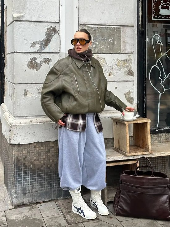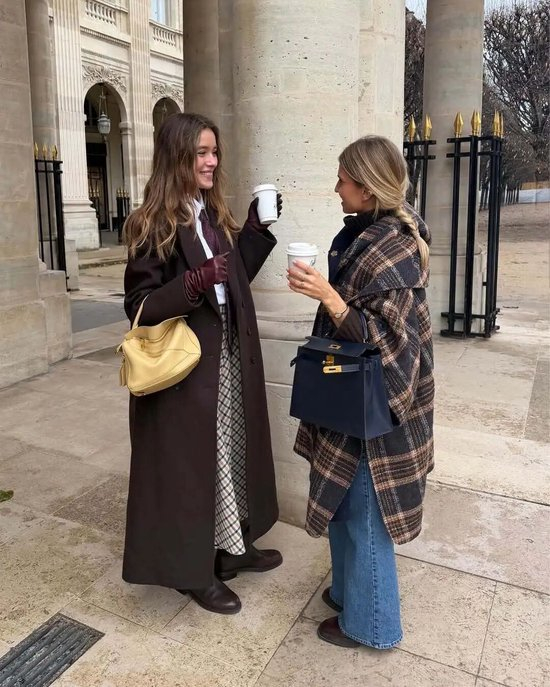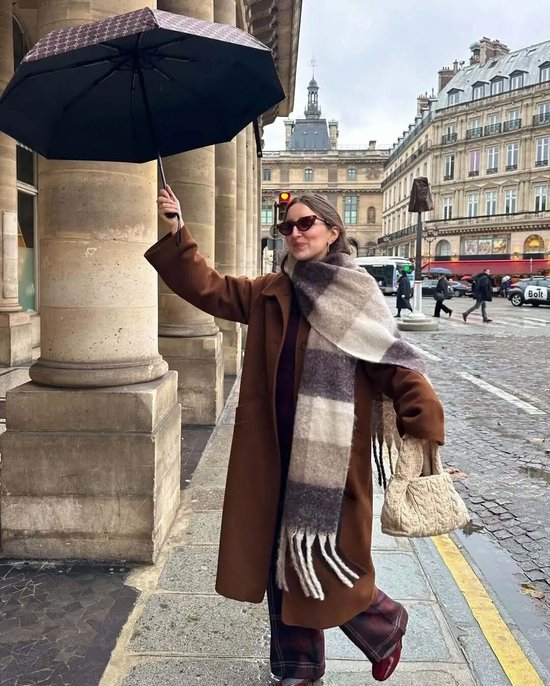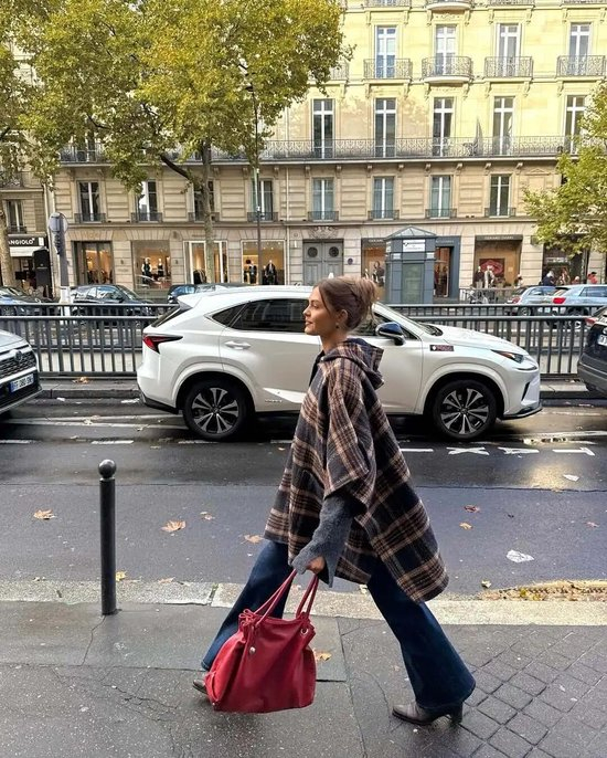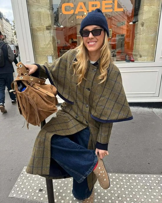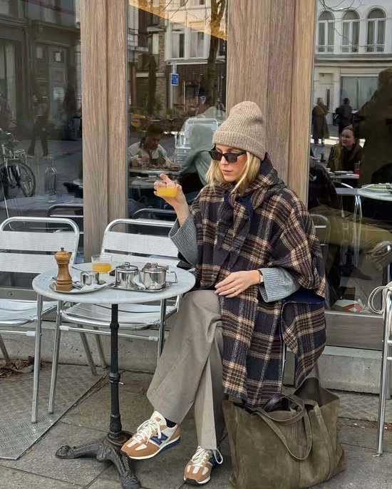 除了经典的大衣板型,今年不少博主穿的是这种斗篷式的格纹外套,衣摆自然垂坠的弧度会更加有复古氛围,搭配窄腿裤或是喇叭裤,慵懒又不失干练。
