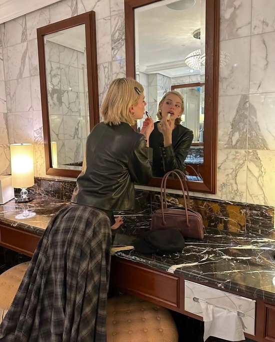 或者拎一只小巧的格纹包袋,巴掌大的尺寸刚好点睛,不会让造型显得累赘。