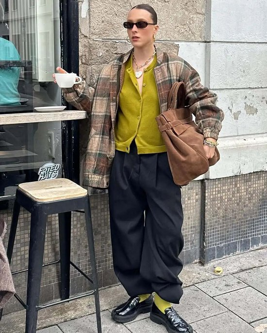 谁说格纹长裤只能是学生气十足的休闲穿搭?阔腿板型的格纹长裤可以说百搭又不无趣,尤其是冬天面对满衣柜的深色外套,格纹裤能够快速为造型增添点色彩。