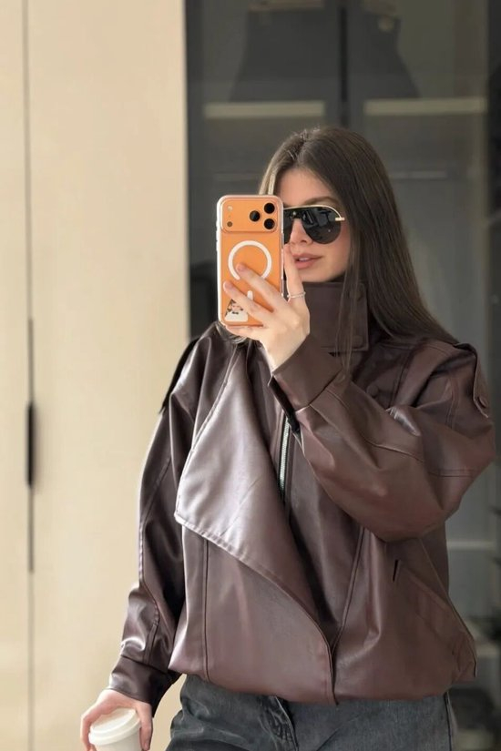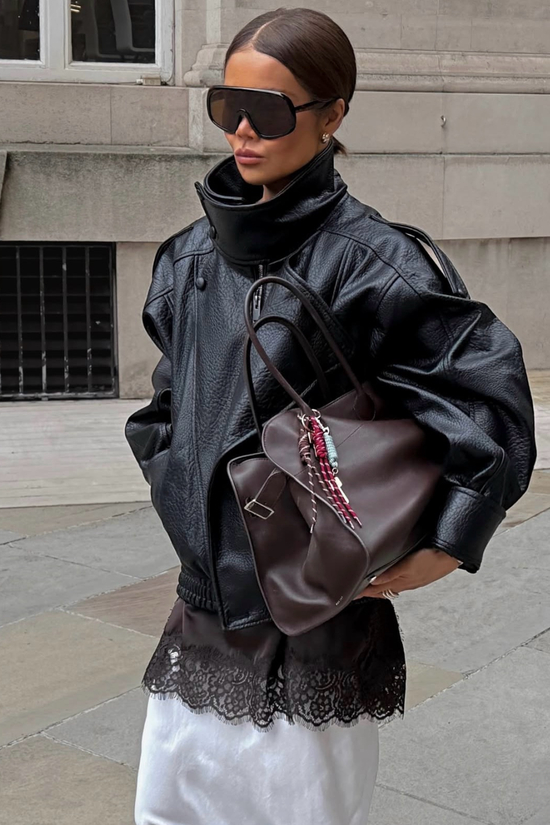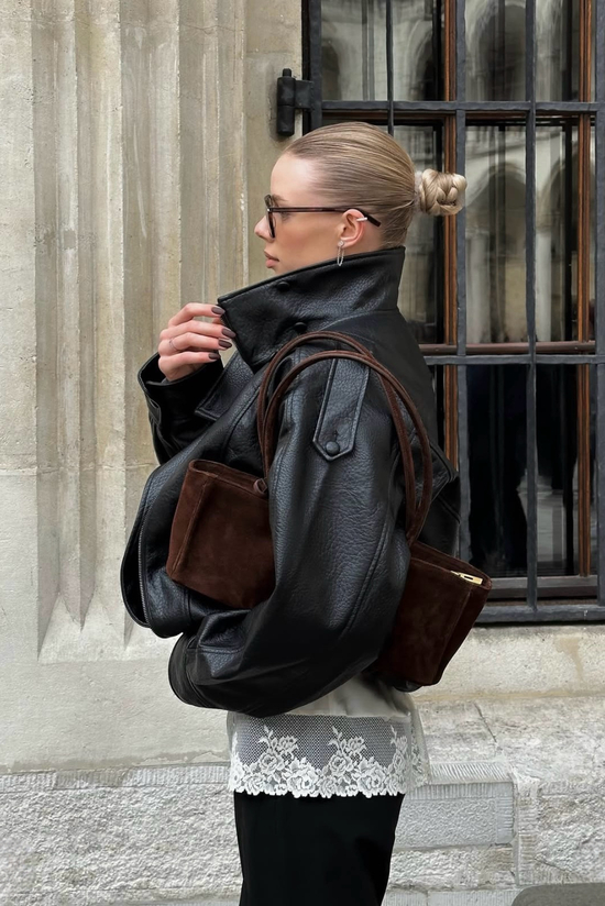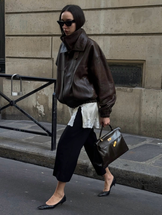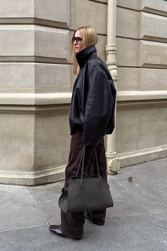 除了黑色外,深棕色皮衣则更适配日常,低调的棕色不张扬,下班直接去聚餐不用换衣服,皮衣的哑光质感提升了整体精致度。