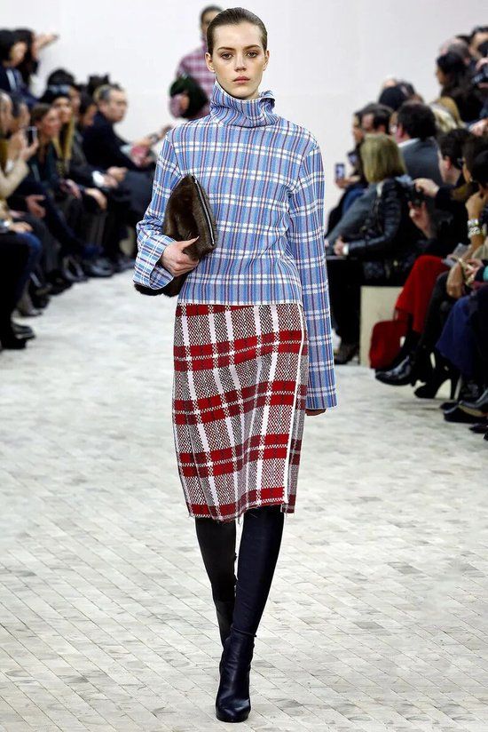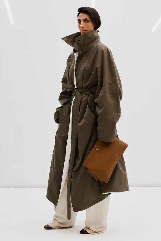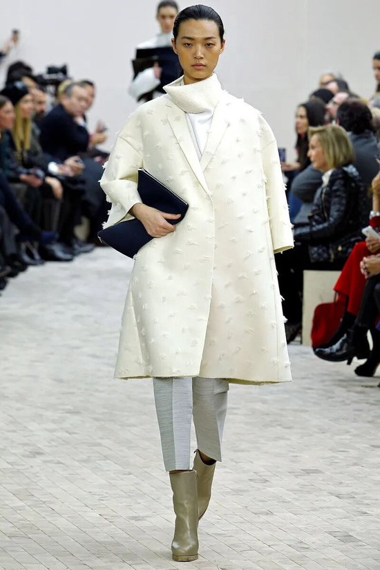 追溯起来,漏斗领的流行绝非偶然。Phoebe Philo是推动这股风潮的关键人物,早在她执掌Céline时期,漏斗领就成为品牌标志性设计,从皮衣到衬衫,立体领型掀起一波Clean Fit风潮。她回归创立个人品牌后,漏斗领更是设计核心,足见其经典生命力。