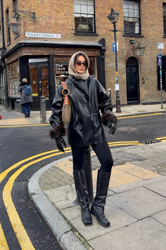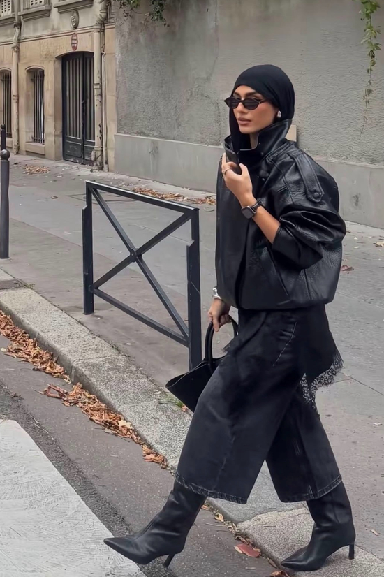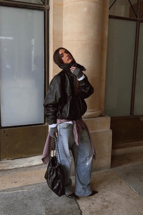 做旧纹理的皮衣绝对是第一选择,漏斗领立起既防风又显脸小,内搭纯色紧身打底+同色阔腿裤,走路带风回头率拉满,皮质越穿越软,穿多少年都不过时。