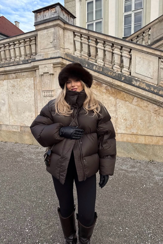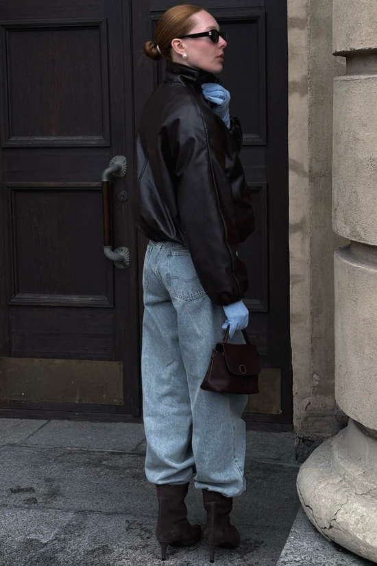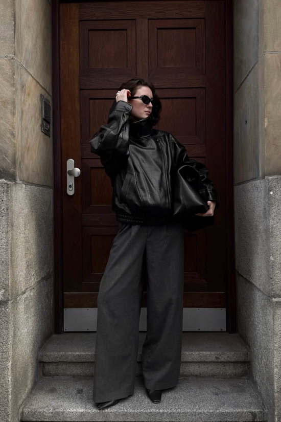挪威博主Darja Barannik的短款漏斗领夹克穿搭,长度及腰的设计让腰线瞬间上移,搭配阔腿裤,干练的都市感扑面而来。