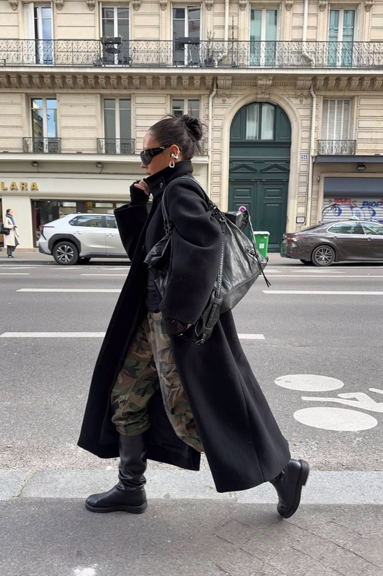 高高立起的衣领半掩面庞,搭配一副墨镜,轻松营造出高级的疏离气质。