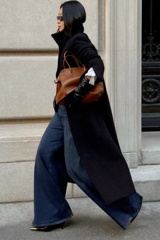 想要低调高级感,可以试试不挑身材的宽松款式,无论长款短款,内搭针织衫+直筒牛仔裤。