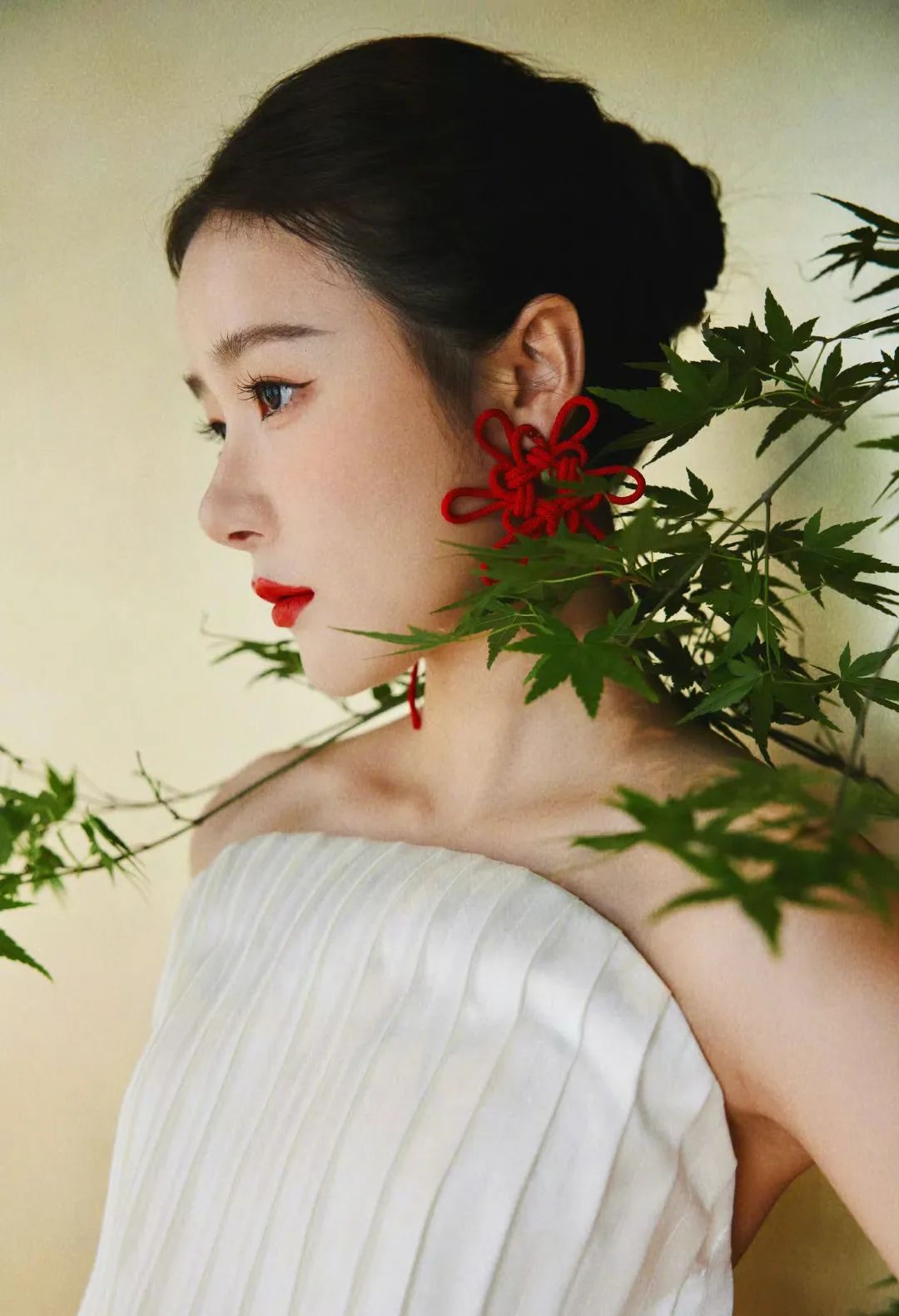 在妆容中运用红色更应该奉行“少即是多”的准则,不仅面积上需要做到正确取舍,冷暖、明暗都要相互适配。以徐娇的这款干净的国风美人红妆为例,她的暗红色绳结耳饰属于暗红色调,所以唇色自然就选择了同款。而眼妆和腮红仅仅强调轮廓就够,眉毛也是淡淡的野生感,让妆容整体浓淡和谐。
