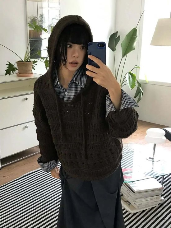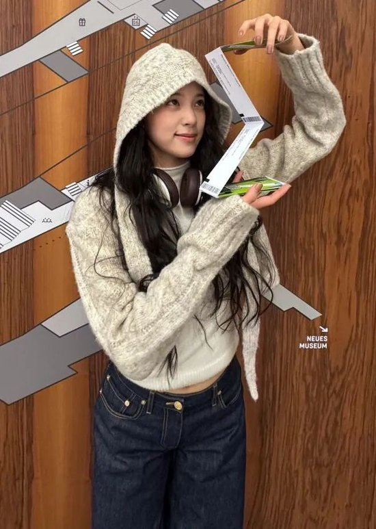 她选择同色系的针织帽衫