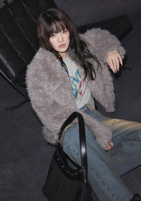 充满光泽感的毛毛内搭一件灰色运动衫,