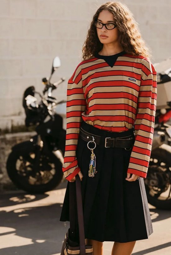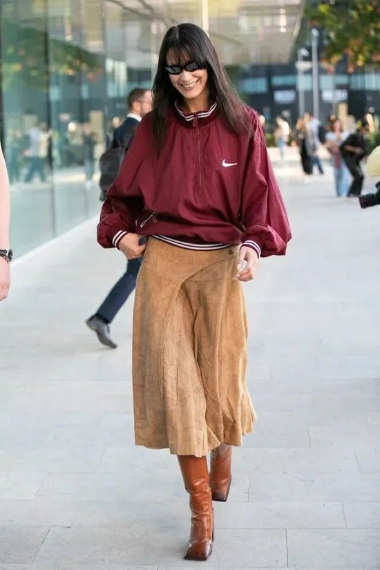 运动衫与立体剪裁的半裙组合,