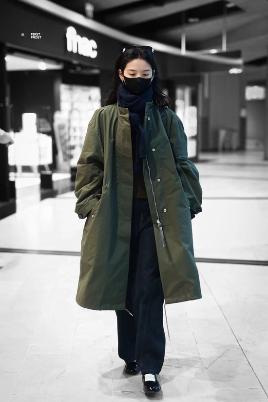 章若楠身穿的这件墨绿色A字形外套,
