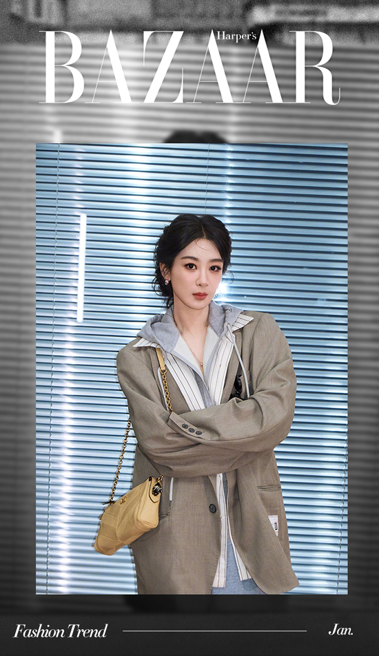 宽松的西装外套内搭灰色卫衣,