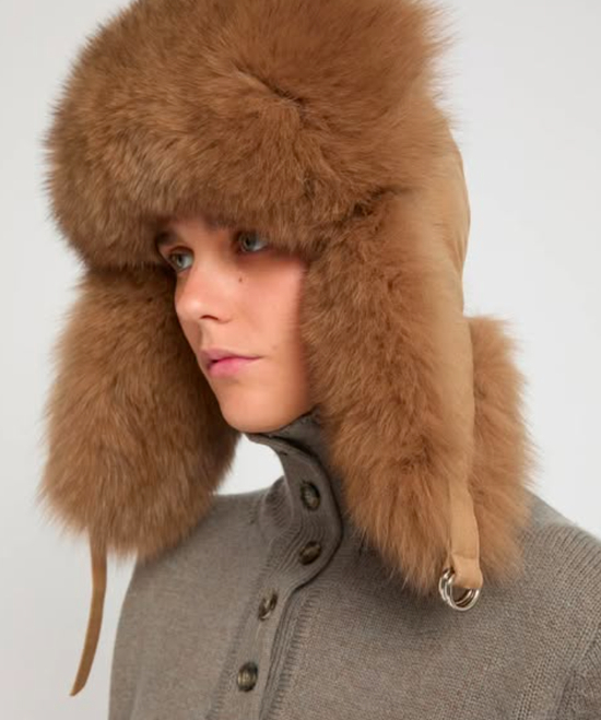 还有Yves Salomon的飞行员帽,以羽绒质感为概念,配上了又长又滑的毛毛内里,质感非常柔滑。