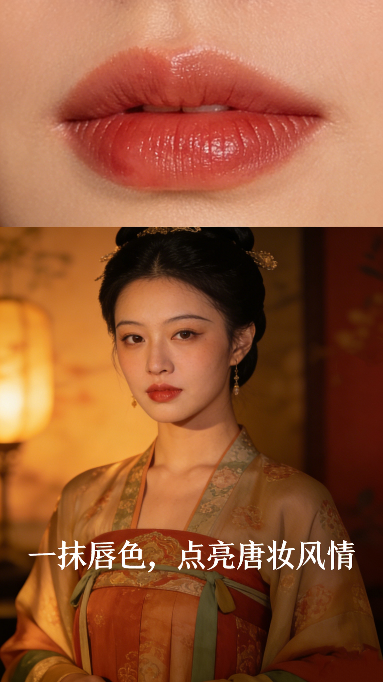 唇妆:薄涂=唐代酒晕妆效。