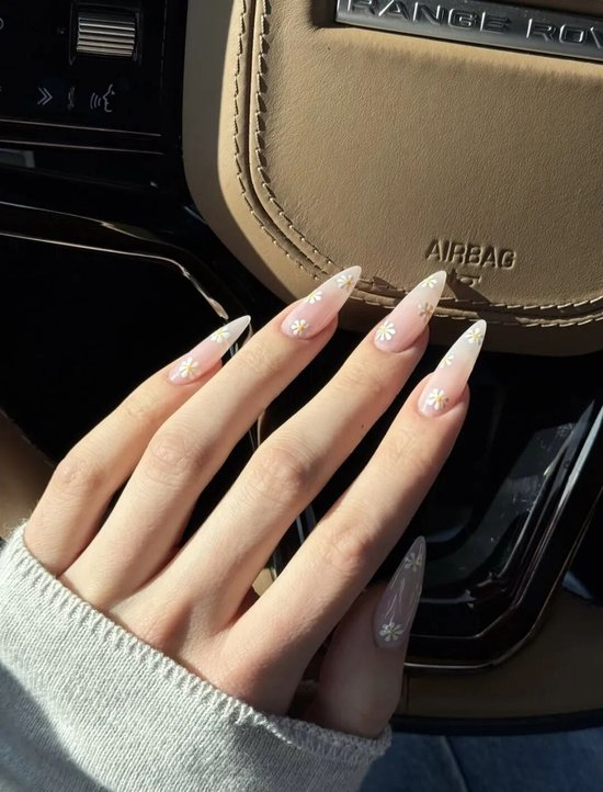 美甲们不再用夸张的彩色钻石来装饰手部,而是纷纷选择了水彩感和手绘感的极简花型:淡淡的樱花粉、嫩黄、奶白交织在一起,几笔轻描淡写的线条,就勾勒出一朵含苞待放的小雏菊或一朵樱花。