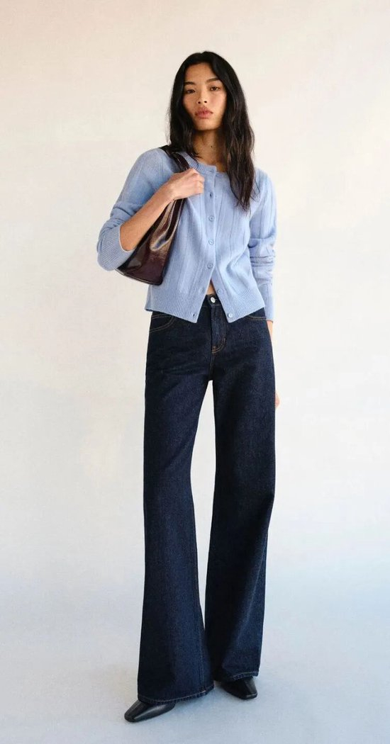 淡淡的天蓝色毛衣,色泽纯粹而内敛,巧妙平衡了灰色的冷静与蓝色的开阔。它比灰色清新,又比亮蓝色沉稳,上身便能赋予一种清澈而果敢的气质。