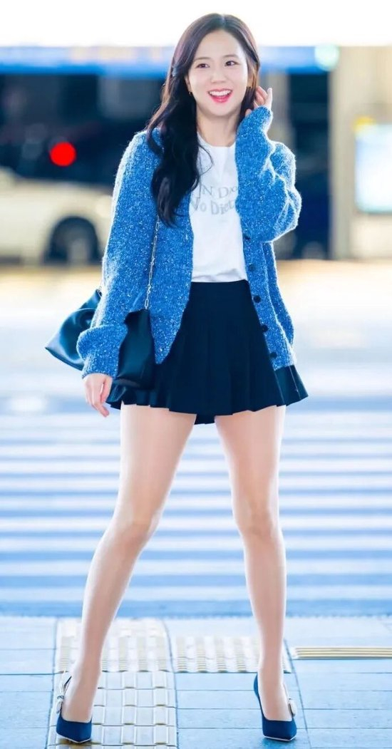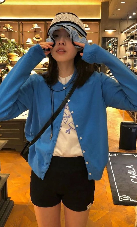 金智秀这身搭配简约而富有巧思,整体色调柔和统一。蓝色针织开衫休闲中透出温润的质感,虽然只是内搭了一件简约的白色T恤衫,却碰撞出丰富的视觉层次,再加上线条利落的短裙,让开衫低调的配色更凸显了面料与板型本身的质感。