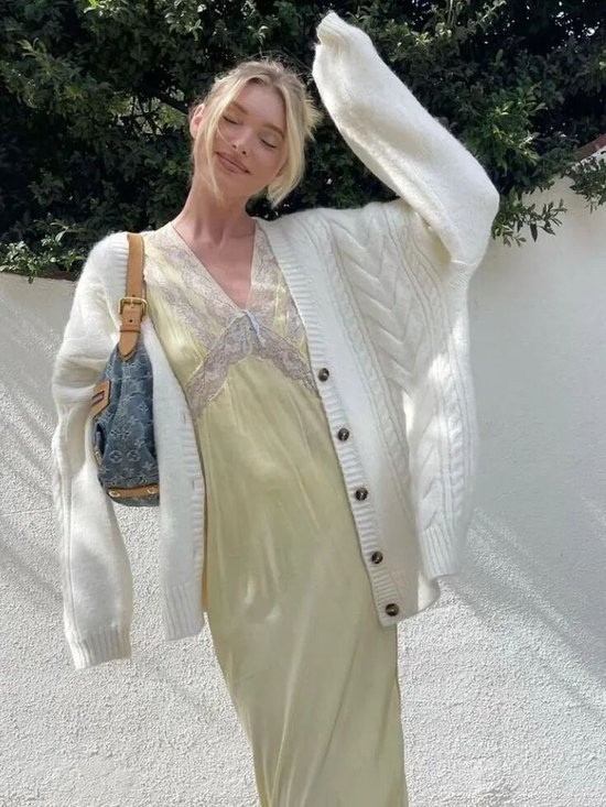 夏天的连身裙也可以与开衫搭配,带有细腻纹理的毛衣,配合凸显身材的连衣裙,能营造出一种轻松随性的松弛氛围。