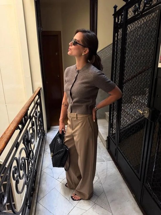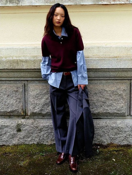 廓形衬衫与开衫的叠穿也是很完美的结合。将衬衫的领口作为外层,再将衬衫露出袖口与下摆,瞬间提升造型的立体与精致。短袖毛衣更是叠穿利器,搭配西装裤,很适合职场穿着。