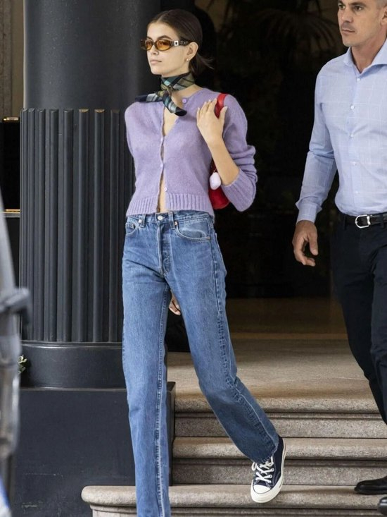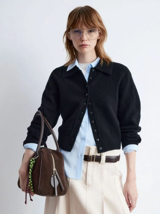 在开衫的款式上,可以选择带有经典绞花、罗纹肌理的毛衣,或是POLO领开衫,充满了故事感与学院派的知性气息。赵今麦这身造型就是用Polo领短款小开衫与白色T恤衫叠搭,特殊的针织质感与T恤衫层次交织,灰色的色调则平衡了甜腻感,再戴上银边框墨镜,酷感十足。