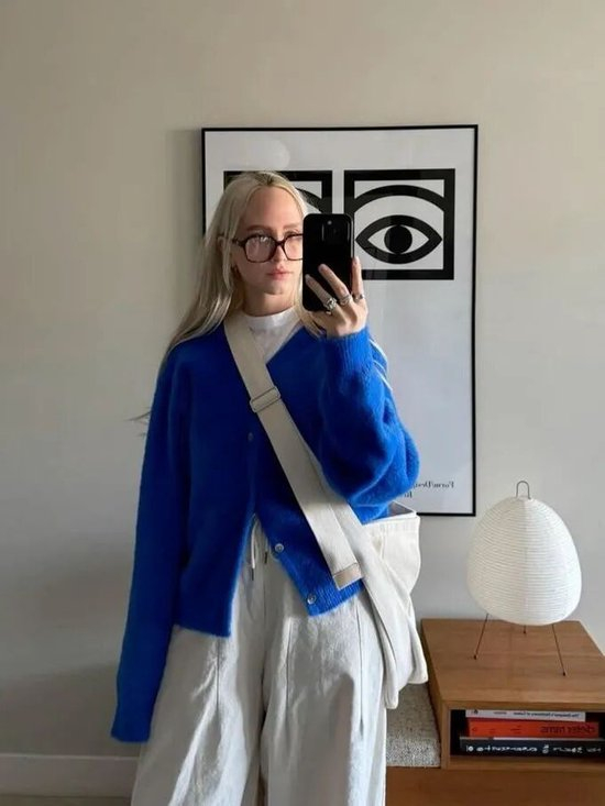 克莱因蓝色拥有如深海般的纯粹与明亮度,这种高饱和度的蓝色与毛衣的柔软质感相遇,碰撞出一种深邃而自然的静谧感。它仿佛能过滤周围的喧嚣,营造出一个舒适宁静的视觉氛围。