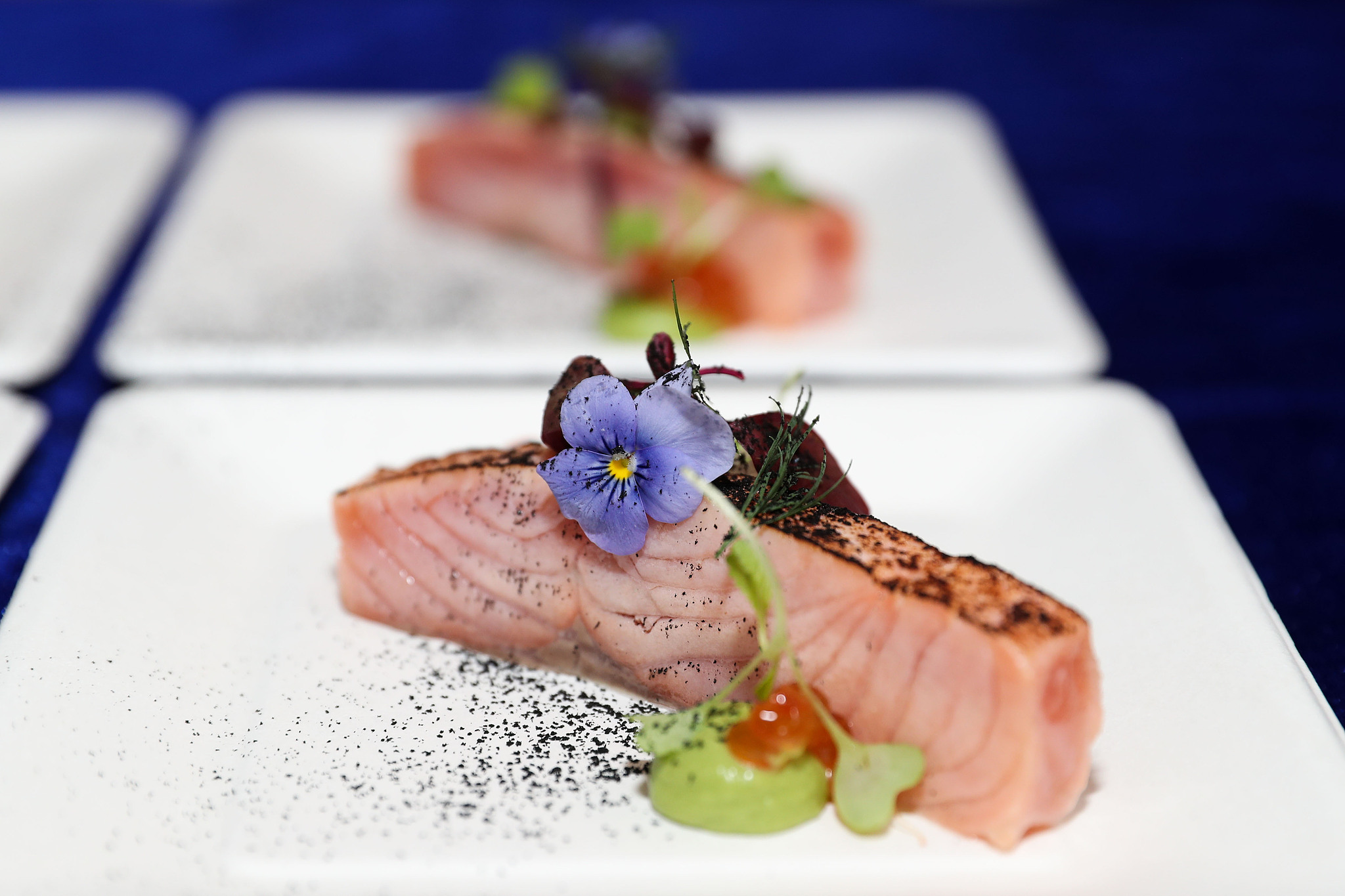 低温慢煮三文鱼柳,让肉质呈现出温柔的橘粉色,经轻微炙烤后保留软嫩多汁的口感;香草泥与莳萝的加入,带来清爽的植物风味,平衡了鱼肉的油脂感;墨鱼粉与鲑鱼籽酱,则赋予爆浆咸鲜的口感与宝石般的光泽。