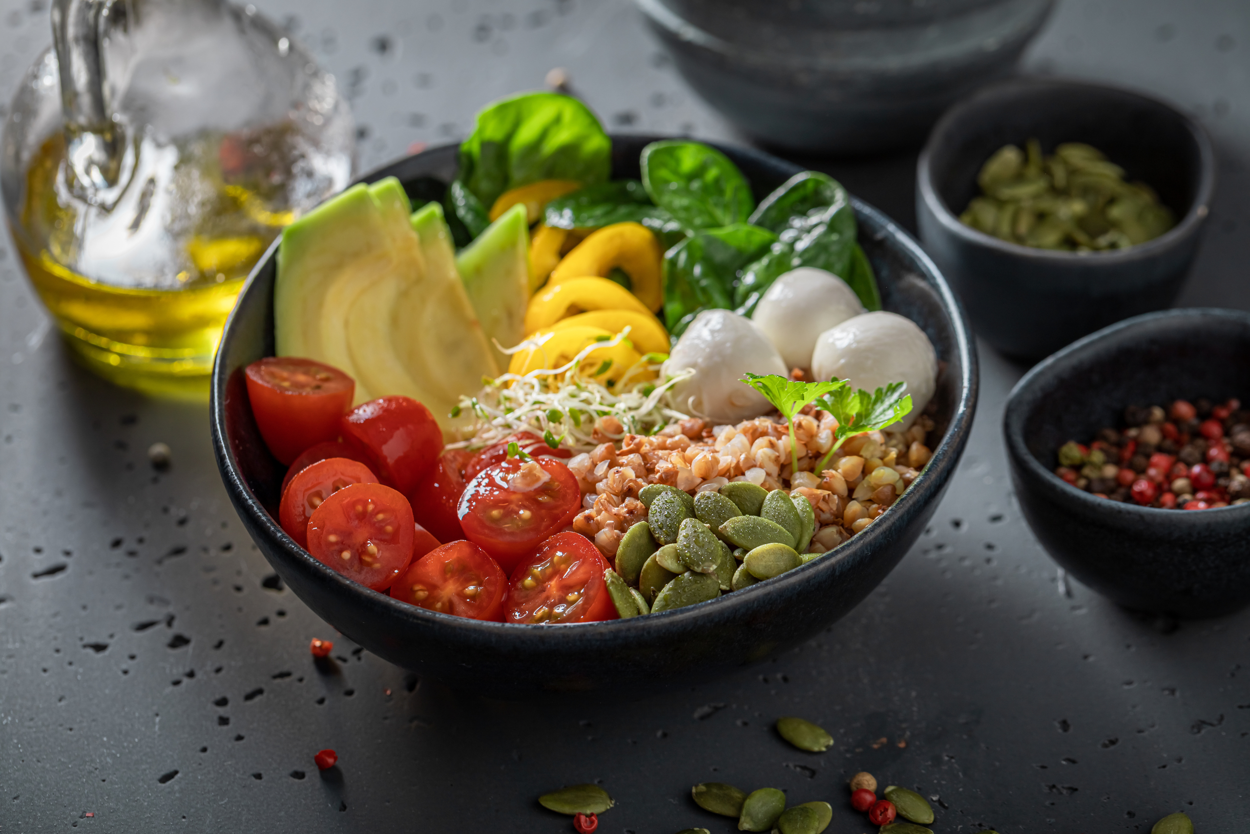 风味转化的关键,是将小柿子提前糖渍过,与南瓜子、杏仁、甜椒混合,再用少许香醋和初榨橄榄油调味即可,健康饱腹。