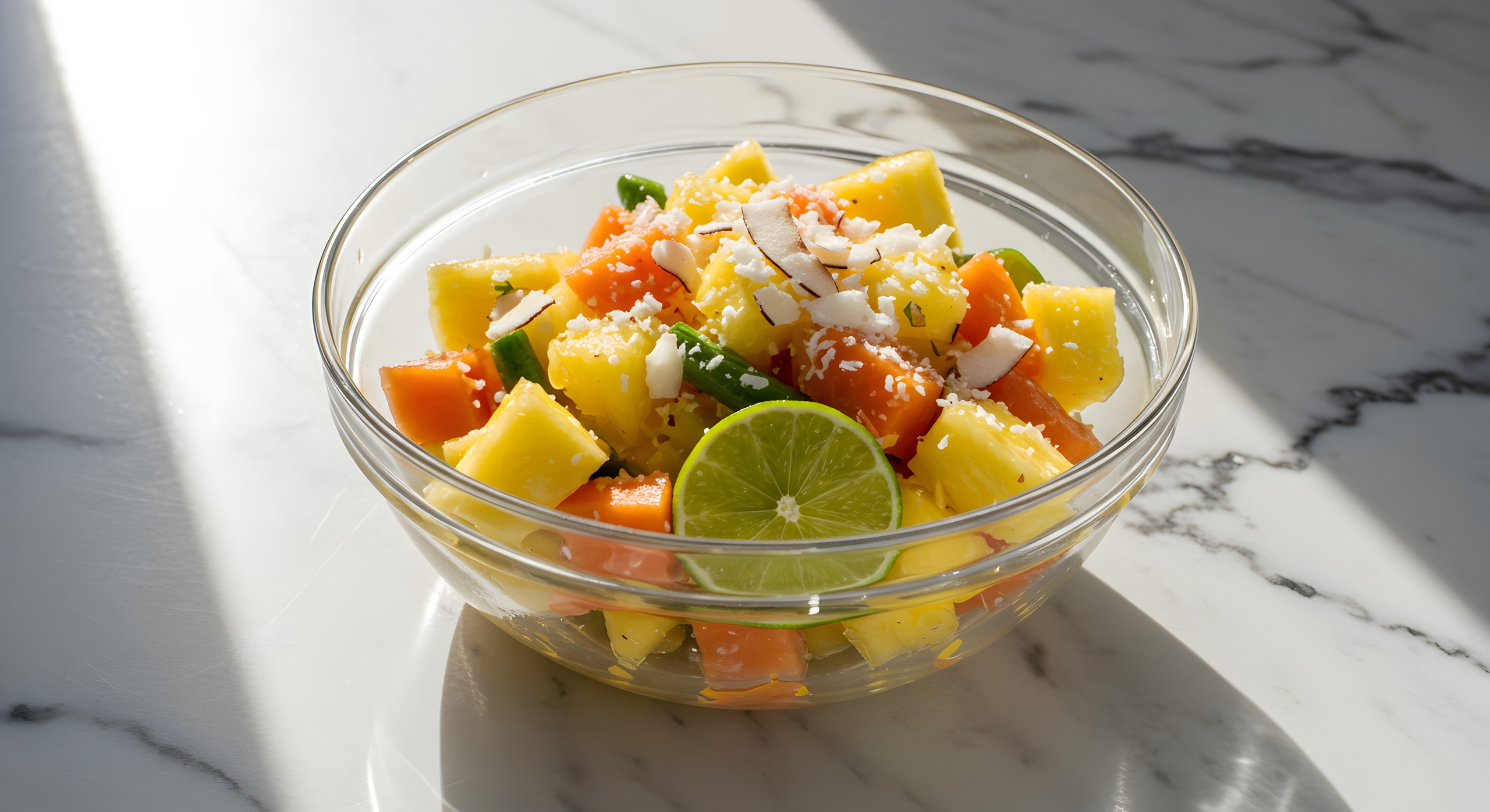 海岛沙拉证明了,美味无需在正餐与甜品间划清界限。青木瓜与菠萝切块,用椰奶、青柠汁、棕榈糖调成的酱汁凉拌,椰子碎的加入,让口感层次更加丰富。