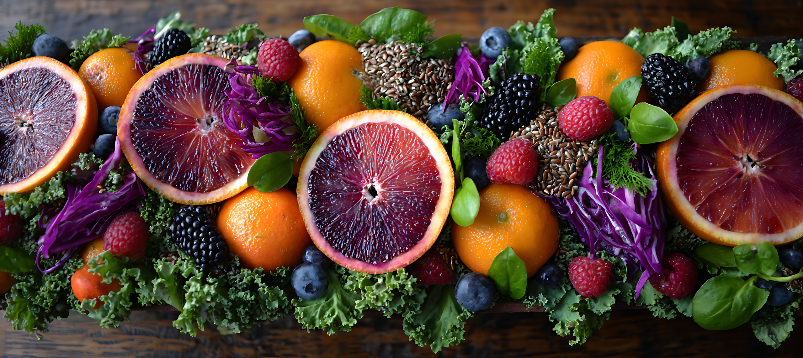 这道菜堪称是超级食物联盟,提前将羽衣甘蓝叶片充分按摩变软,淋上由腰果、柠檬汁、枫糖浆打成的素奶油酱,再与莓果混合血橙拌匀,健康又满足。